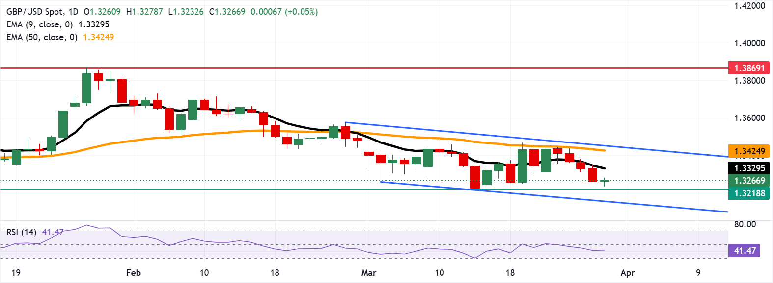قد يجد زوج استرليني/دولار GBP/USD دعمًا فوريًا بالقرب من أدنى مستوى له خلال ثلاثة أشهر عند 1.3218، المسجل في 13 مارس، يليه الحد السفلي للقناة الهابطة عند حوالي 1.3160.